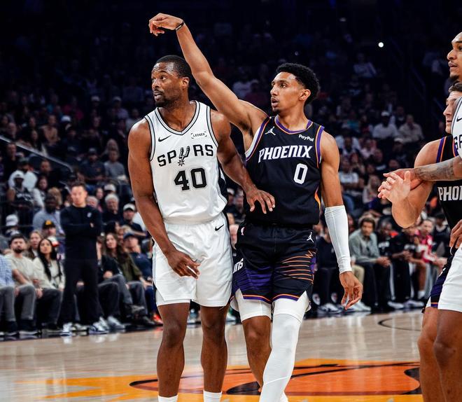 第二节开打文班亚马还在场上,布克则场下休息,文班亚马内线护框成功,凯尔登篮下也被防成,理查兹利用节奏打了文班亚马一球,凯尔登还是强打篮下这次有了,理查兹篮下再次面对文班亚马造成犯规两罚全中35-26,不得不说他替补上来打得真不错。伊戈达罗进攻犯规球权给到马刺,文班亚马拿球就面对双人夹击,麦克劳林接球三分还是不中,太阳前场开球吉莱斯皮漂移长两分命中,卡斯尔不看人助攻凯尔登上篮命中,太阳始终无法缩小分差。阿伦传球失误哈珀持球推进,一个背运轻松过掉理查兹上篮打成2+1分差回到6分,这真的不像一名新秀球员。理查兹中距离命中,哈珀传球被断布克接球三分命中分差来到两位数,打到现在文班亚马一分没得!布莱恩特上篮不中,尚帕尼前场篮板传球失误,布克反击给到阿伦助攻理查兹暴扣太阳扩大领先到13分,马刺不得不暂停!